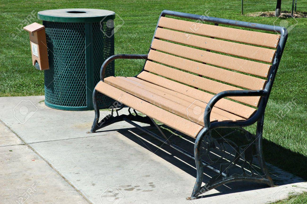 Skip to the end of the images gallery. Wooden bench and trash can in the park. A park bench and trash can in a public place bench and trash can on beach by ocean. 2 of them has about the same effect as a normal small park.