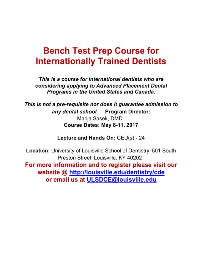 Dental Bench Test Preparatory Course. This course offers details on fixed and removable the ultimate bench test preparatory course for international dentists to get you ready, even if you've never done a crown prep you need to be. This course is not a prerequisite nor does it guarantee admission to any dental school.