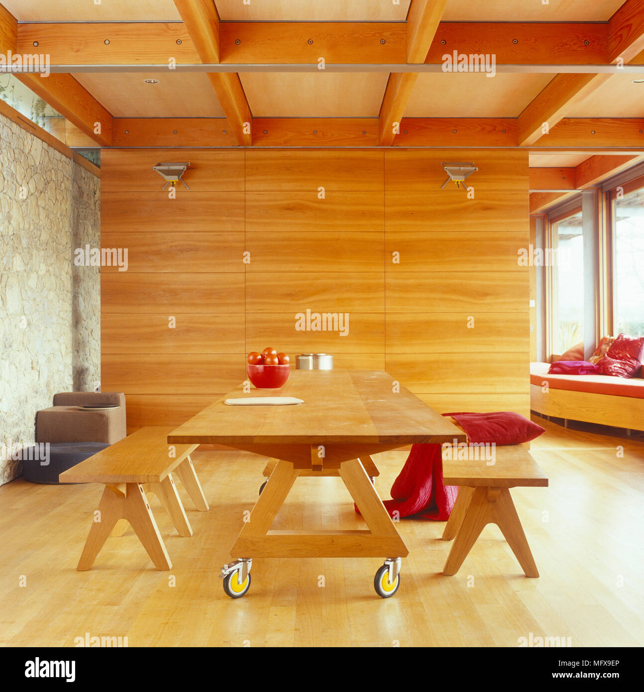 A Modern Open Plan Sitting Room With Fireplace Wood Dining Table And Bench Seats Upholstered Sofa Silver Mirror Stock Photo Alamy from c8.alamy.com