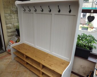 High back monks benches with coat hooks. Storage bench coat hook shelf and shoe storage unit hallway. Eight silver hooks provide space for coats and bags while three cubbies can be used for keys and accessories. Our radiator cover monks bench is designed specifically for covering a radiator whilst also creating additional storage and seating.