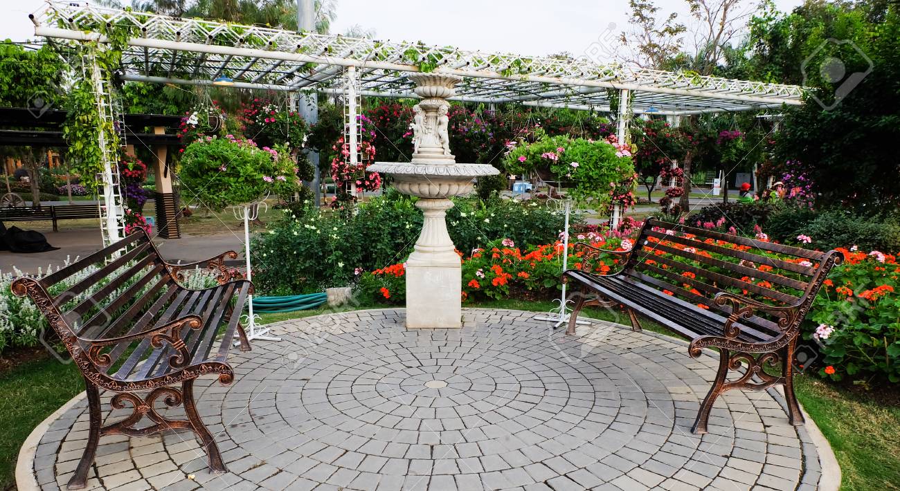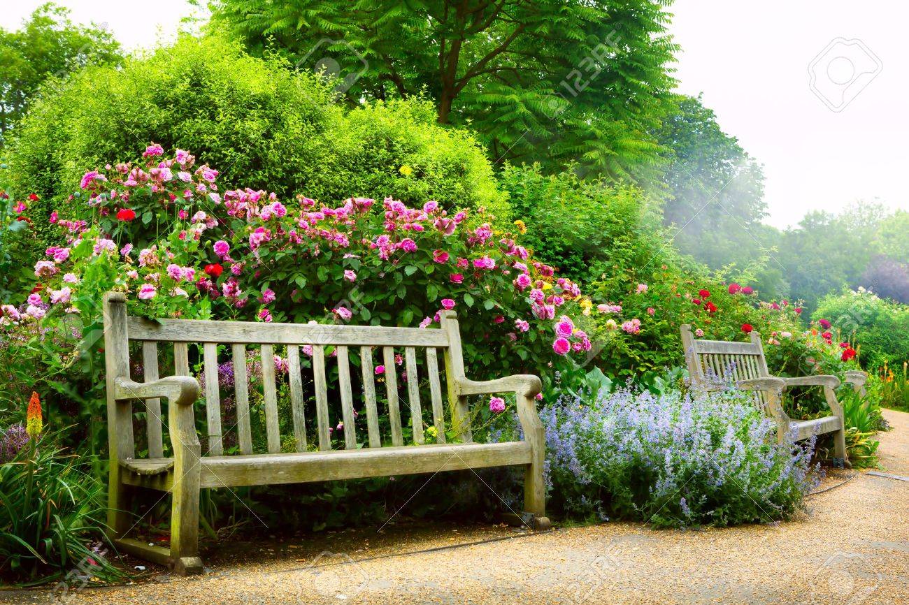 Park Bench In Flower Garden. If you intend to use an image you find here for commercial use, please be aware that some photos do require a model or a. Stone pathway leading to a white bench, with cottage colourful flowers in bloom on both sides, shaped conifers, shrubs and tall trees in an english garden on a sunny summer day.