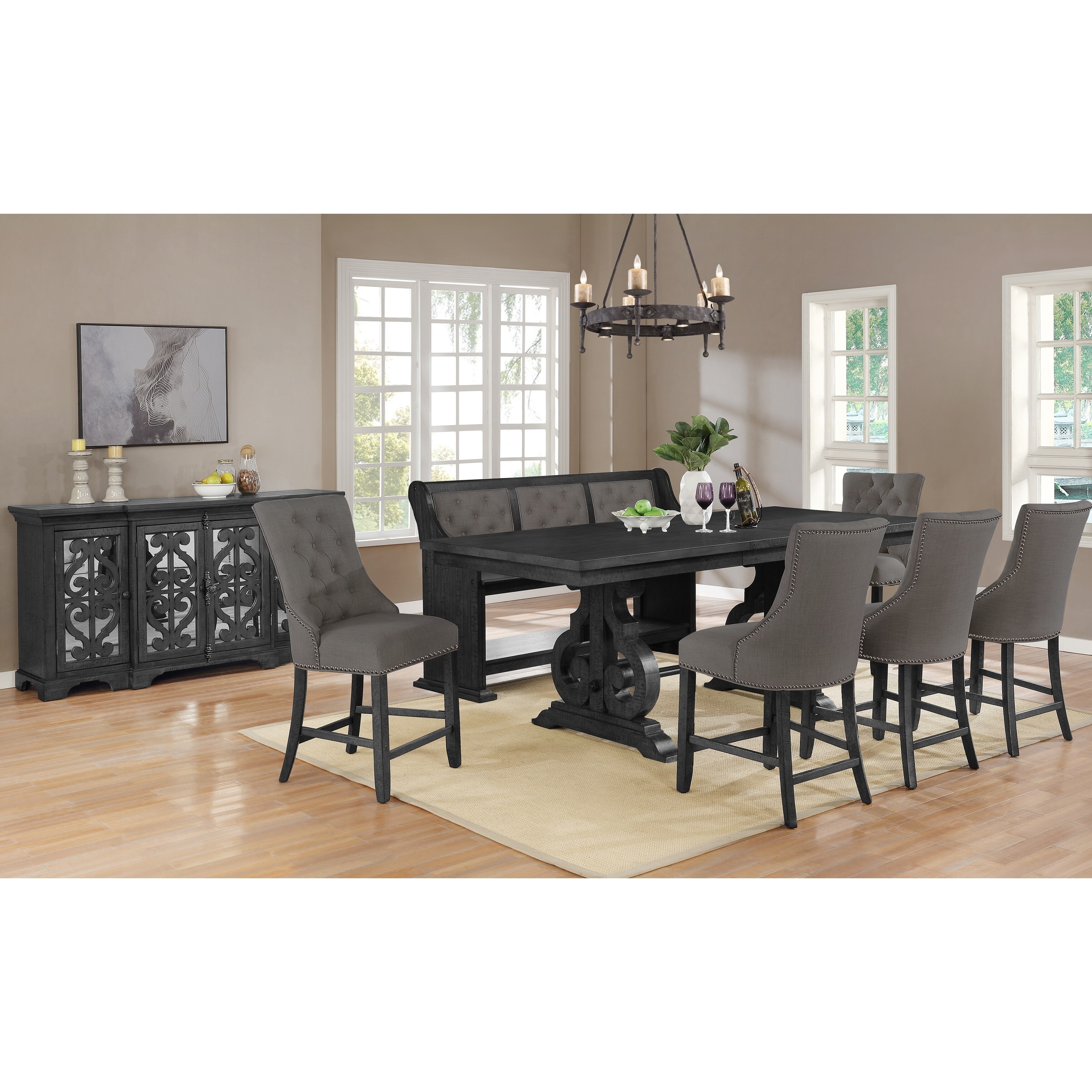 Tufted Counter Height Bench. The counter height bench has a luxurious beige or dark grey linen upholstery that is accented by a nailhead trim, button tufted seat cushion and. This bench mimics the trestle base of the table, making it the perfect matching set.